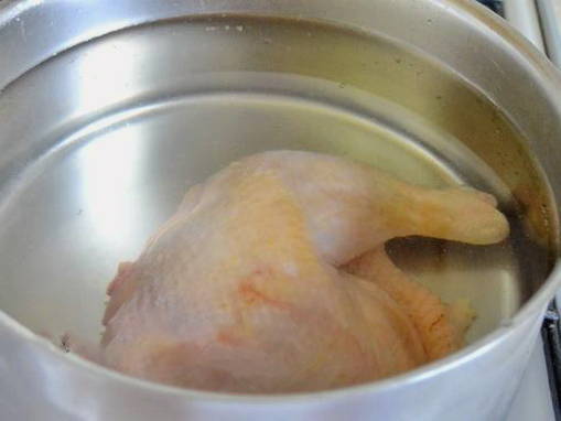 - Doe water in een pan van geschikte grootte, zet op het vuur en breng aan de kook. Spoel het vlees af onder stromend water en leg het in kokend water. Kook de bouillon gedurende 1 uur, verwijder indien nodig het schuim op het oppervlak met een schuimspaan. Als het vlees gaar is, haal je het uit de pan en zet je het apart in een aparte kom, je hebt het later nodig. Je hoeft de kippenbouillon niet te filteren, maar als je het in varkensvlees of rundvlees kookt, kun je het beter door een fijne zeef halen.