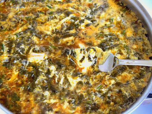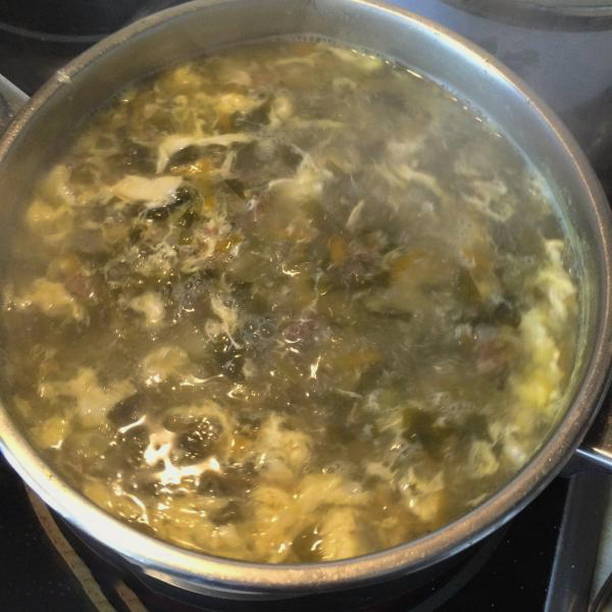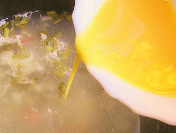 - Giet het eiermengsel in een dun straaltje bij de hete soep en roer krachtig door de inhoud van de pan zodat het ei in dunne draadjes grijpt. Zet vervolgens het vuur uit, dek de soep af met een deksel en laat 5-10 minuten trekken.