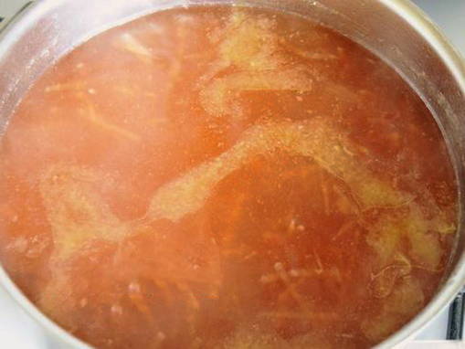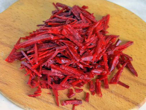 - Schil de bieten, spoel af met water en snij in dunne reepjes. Het is onwenselijk om het te raspen, anders krijg je geen soep, maar iets dat meer op pap lijkt.