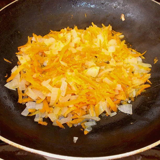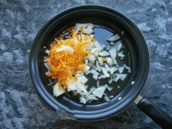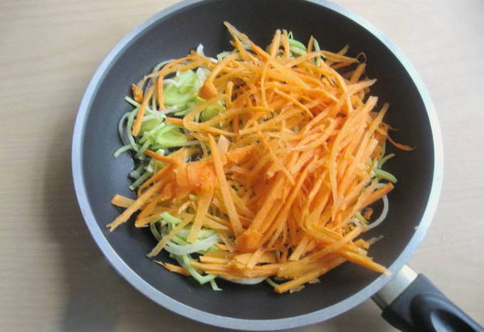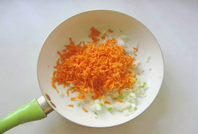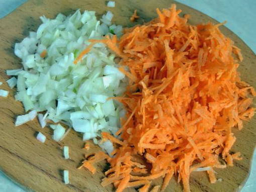 - Schil en snijd de tweede ui op dezelfde manier, was de wortelen en rasp ze op een grove rasp. Verwarm een koekenpan voor met plantaardige olie en leg de groenten erop.