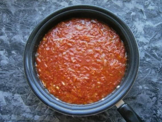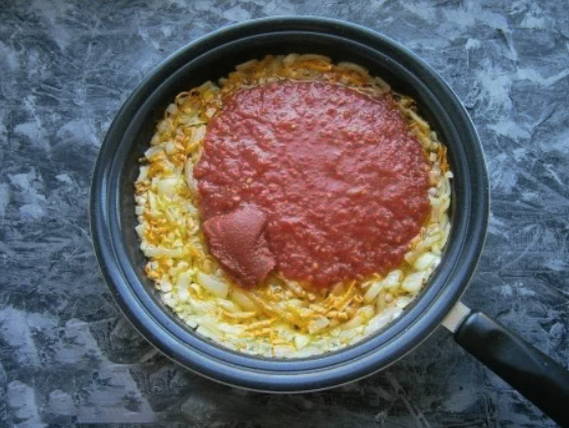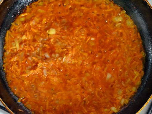 - Bak de uien en wortelen op middelhoog vuur tot ze zacht zijn, af en toe roeren, voeg dan tomatenpuree toe en indien nodig een beetje water.
