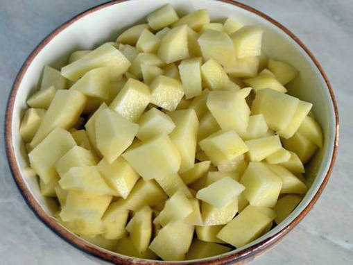 - Doe koud water in een pan, doe de gehakte aardappelen en zet in brand.
