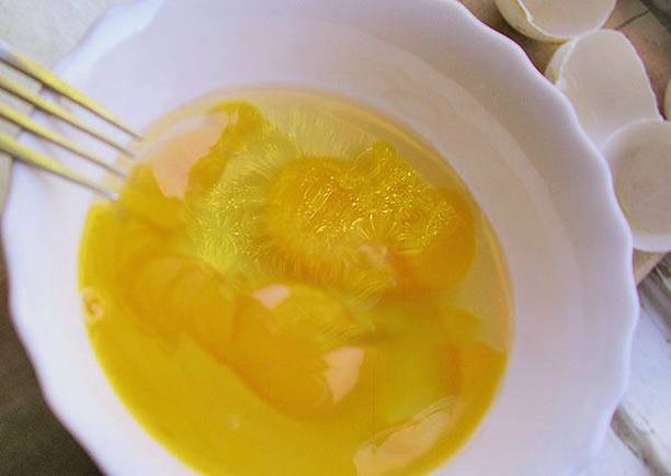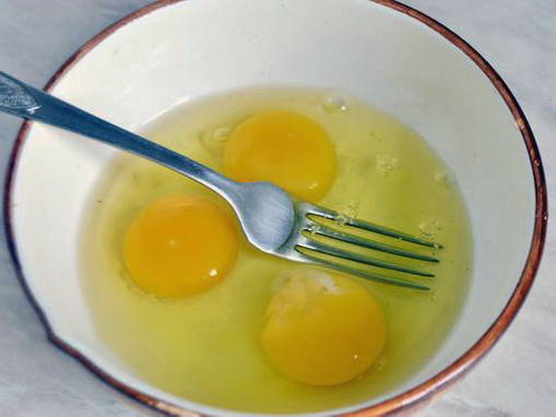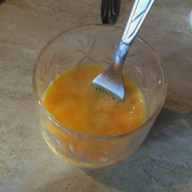 - Breek de kippeneieren in een glas en mix ze met een vork tot een gladde massa.