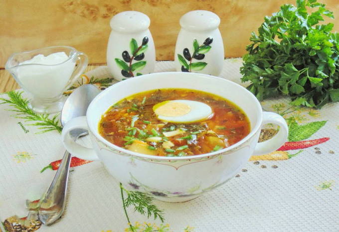 Een eenvoudig en heerlijk recept voor zuring borsjt met ei zonder vlees