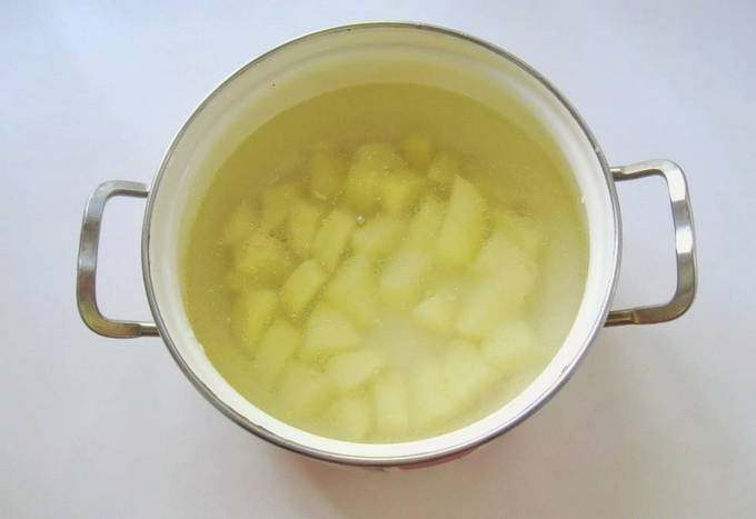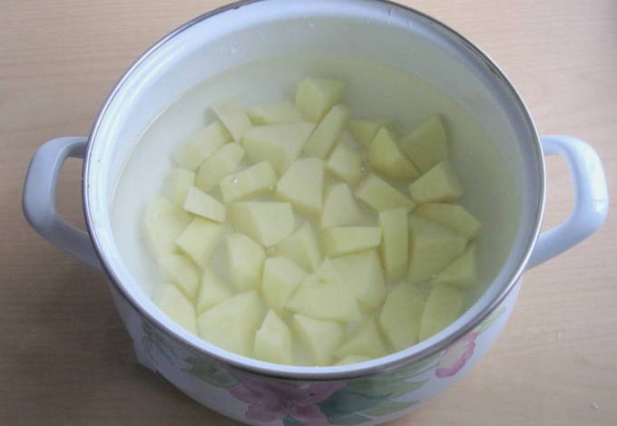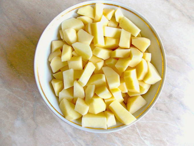 - Was en schil de aardappelen. Snijd in middelgrote stukken en spoel af onder stromend water. Doe het in een pan met bouillon en kook 5-7 minuten.