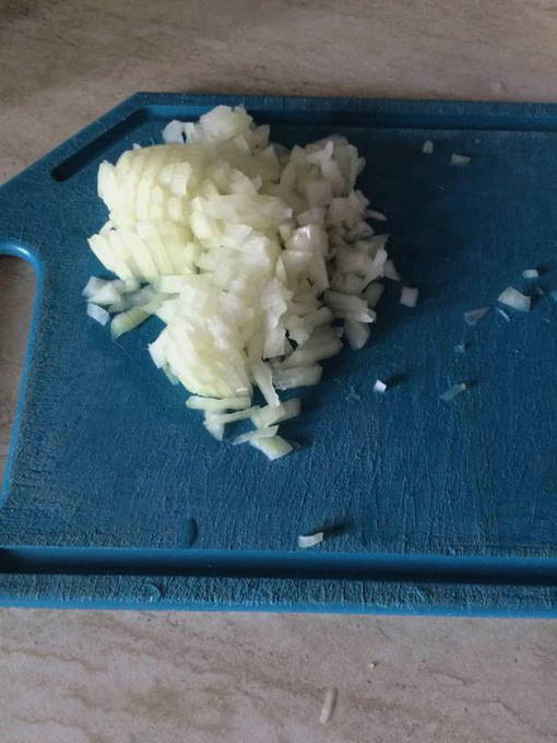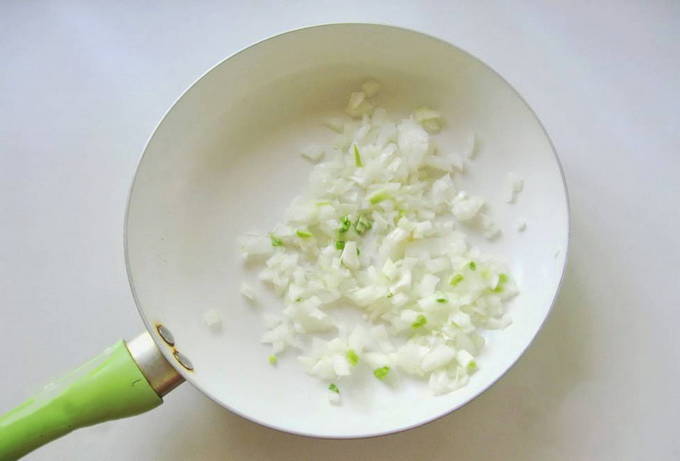 - Pel in de tussentijd de ui en snij in kleine blokjes. Plaats in een koekenpan voorverwarmd met plantaardige olie en bak tot transparant.
