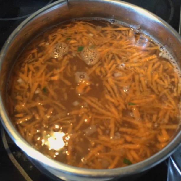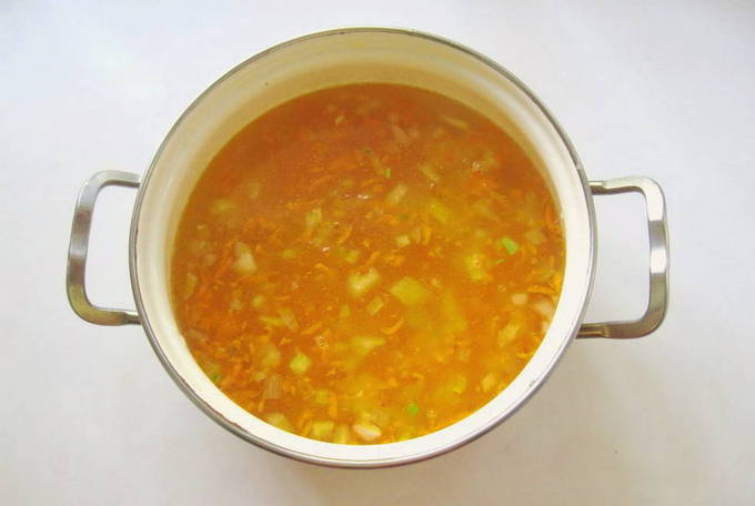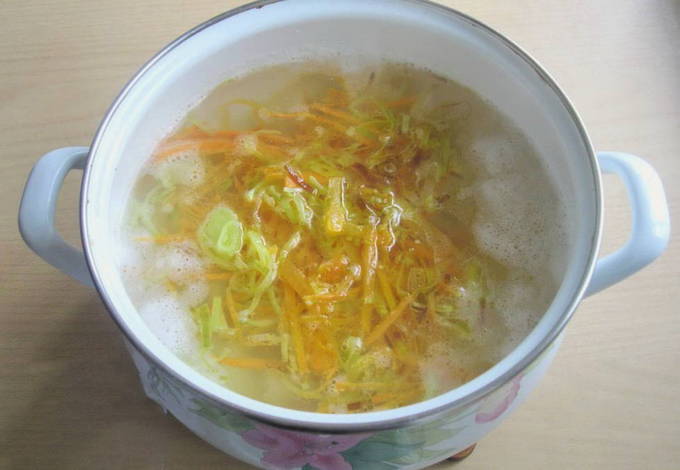 - Voeg vervolgens de frituur toe aan de soep, roer alle groenten om en kook tot de aardappelen volledig gaar zijn.