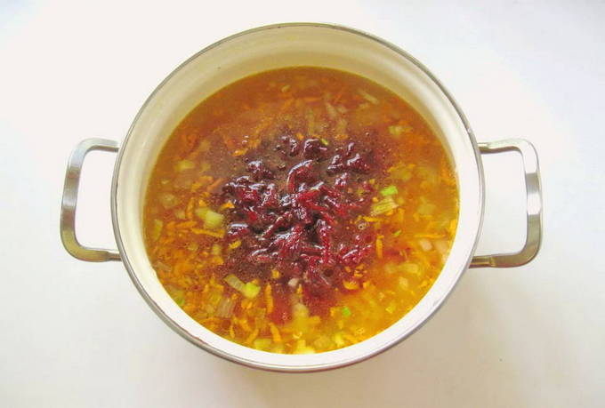 - Doe de gehakte bieten in de bouillon en kook 20-30 minuten op middelhoog vuur. Gedurende deze tijd wordt het rietje doorschijnend en wordt het rode water geelachtig oranje.
