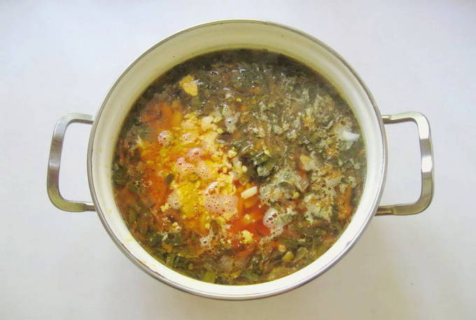 - Roer alle ingrediënten door elkaar en laat de soep nog 5-10 minuten sudderen. Daarna zout naar smaak, maar dit is misschien niet nodig, aangezien zuring uit blik op zich al zout is.