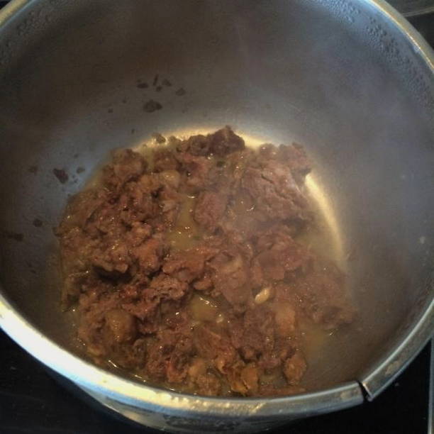 - Breng de stoofpot over van een blikje naar een pan en verwijder het grootste deel van het vet. Verwarm het vlees op laag vuur om het resterende vet te laten smelten.