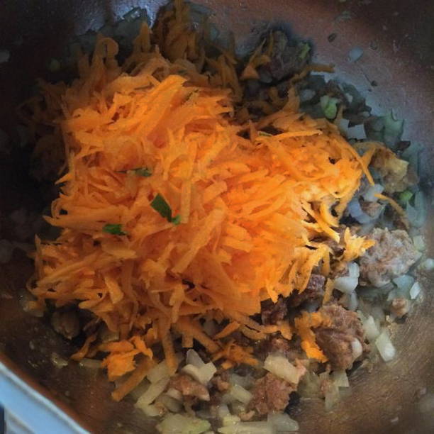 - Was en schil de wortelen, rasp op een grove rasp en voeg toe aan de ui.