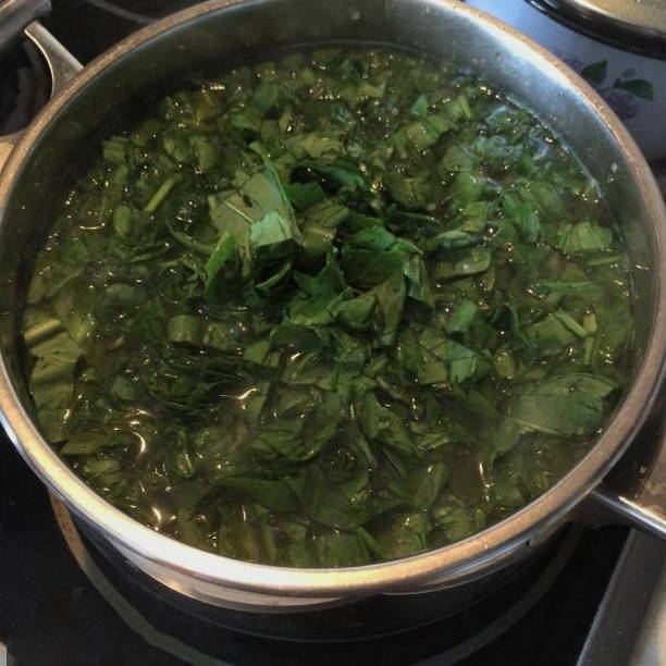 - Voeg 15 minuten nadat de soep kookt de zuring toe aan de pan, meng goed en laat nog 15 minuten sudderen. Snijd ondertussen de aardappelen in middelgrote blokjes en voeg ze na de aangegeven tijd toe aan de soep. Kook tot de aardappelen gaar zijn.