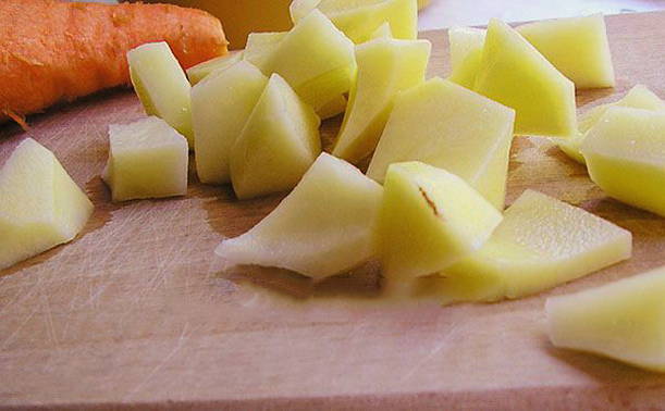 - Was de aardappelen, schil ze en snijd ze in middelgrote blokjes.