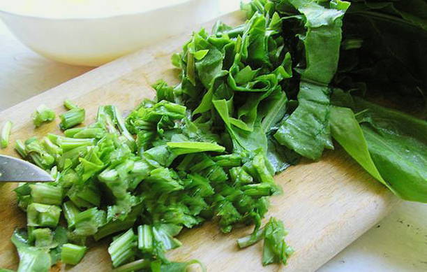 - Spoel de zuring, selecteer de bedorven bladeren, scheid de stekken en hak de greens fijn.