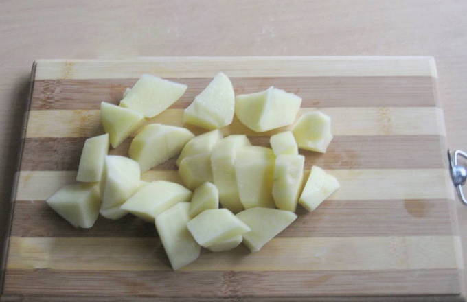 - Was de aardappelen onder stromend water, schil ze en snijd ze in middelgrote blokjes.