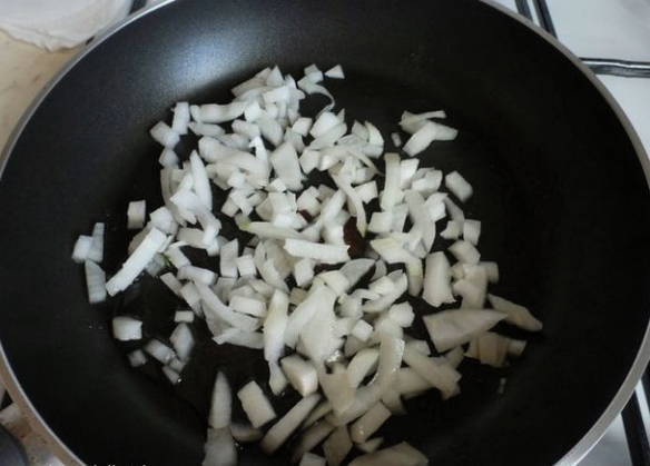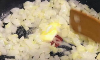 - Pel de uien en snijd ze in kleine blokjes. Verhit in een koekenpan 50 gram boter tot een vloeibare toestand en giet de gesnipperde ui erin. Bak tot ze transparant en zacht zijn, af en toe roeren.