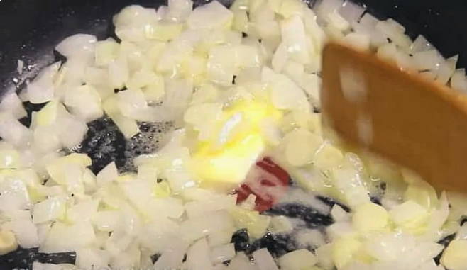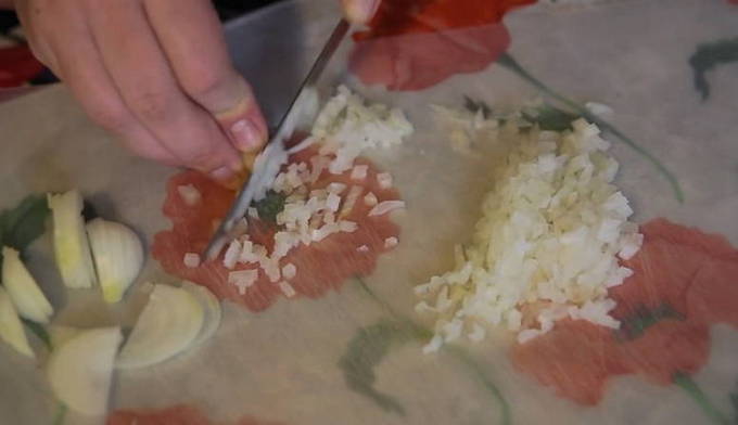 Pel de uien en hak ze fijn met een mes. Hetzelfde doen we met knoflook. Smelt de boter in een diepe koekenpan tot een vloeibare toestand en giet de gesnipperde ui en knoflook erin. Bak, al roerend, tot het licht bloost.