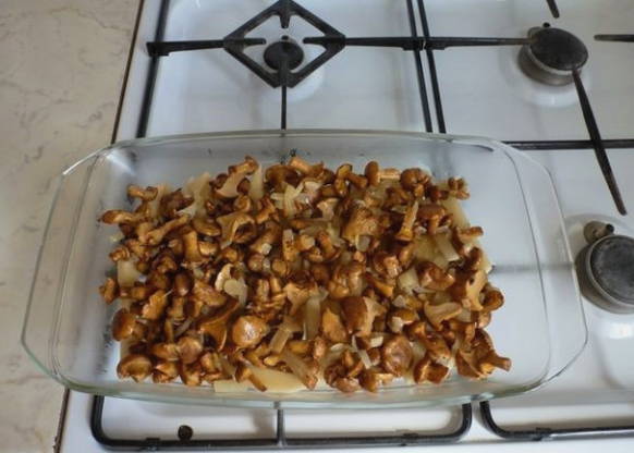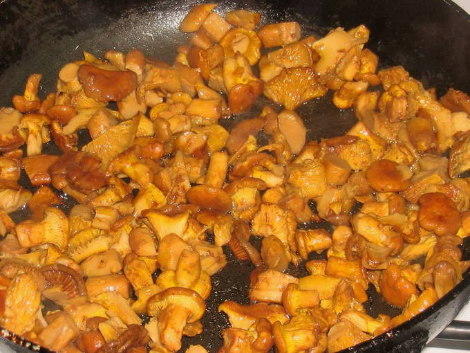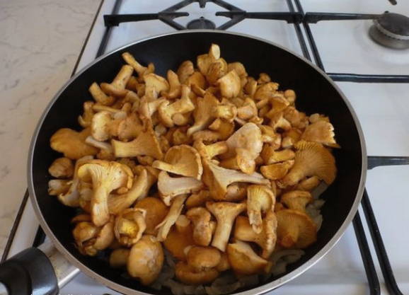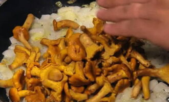 - We maken de cantharellen schoon, spoelen, drogen. Snijd indien nodig grote champignons in kleinere stukken. Giet de voorbereide cantharellen in een koekenpan met uien.
