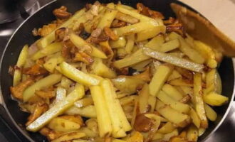 Schil de aardappelen, snijd ze in kleine stukjes en doe ze samen met de cantharellen in een koekenpan. Zout naar smaak, roer en bak verder met de deksel open tot de aardappelen gaar en goudbruin zijn. Het duurt ongeveer vijftien tot twintig minuten.