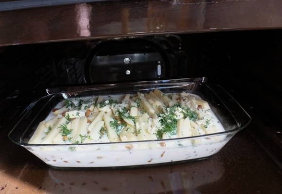 - We zetten de vorm in een voorverwarmde oven op 180 graden en bakken veertig tot vijfenveertig minuten, totdat de aardappelen helemaal zacht zijn.