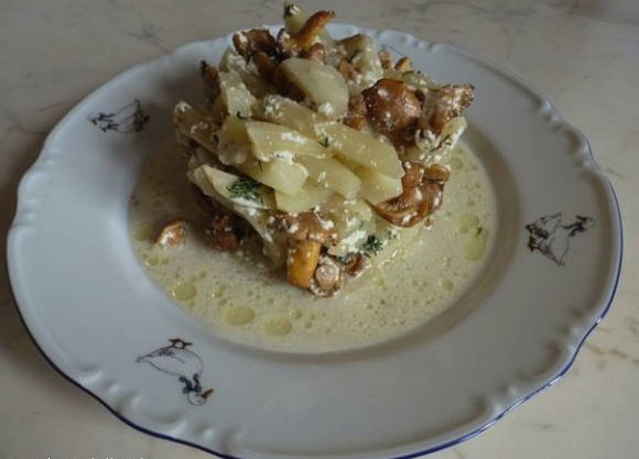 Een heel eenvoudig, ongecompliceerd gerecht, dat desondanks liefhebbers van cantharel zal bekoren. Het belangrijkste is om de ui voor te bruinen in boter. Dit geeft een delicate romige afdronk en versterkt de natuurlijke smaak van de paddenstoelen. Aardappelen kun je natuurlijk het beste jong gebruiken. Het zachte, kruimelige vruchtvlees is de perfecte achtergrond voor cantharellen.
