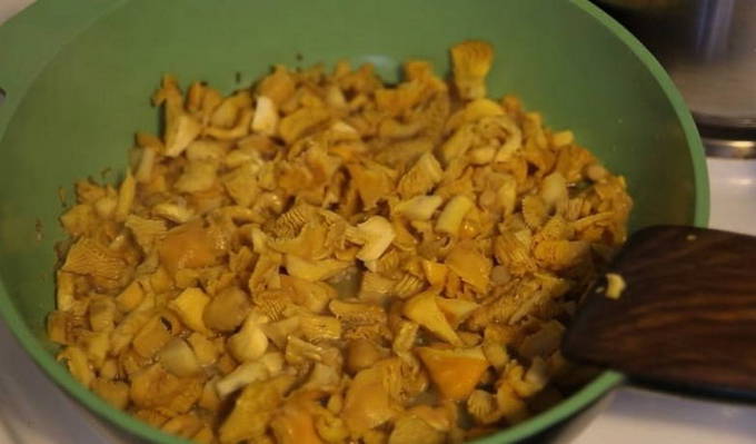 - We bereiden de cantharellen voor: we maken het vuil schoon met een mes en wassen de vruchtlichamen grondig. Na het wassen het water afgieten en de champignons in kleine stukjes snijden.
