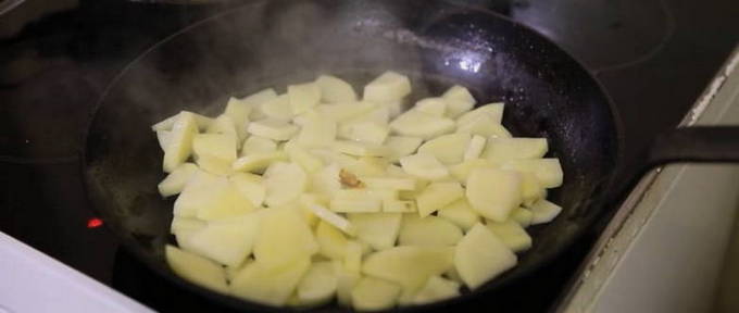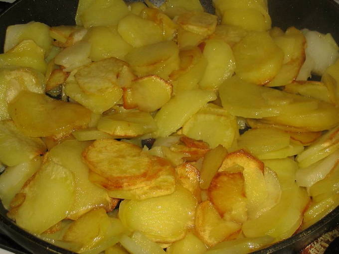 - Schil de aardappelen, spoel en droog. Snijd de knollen in dunne plakjes.Verhit in een andere koekenpan de plantaardige olie en leg de gesneden aardappelen er in een losse laag in. Bak op middelhoog vuur aan de onderkant goudbruin. Leen aardappelen omdraaien en bak de andere kant. Zout naar smaak. Bak de aardappelen nog eens vijftien tot twintig minuten gaar.
