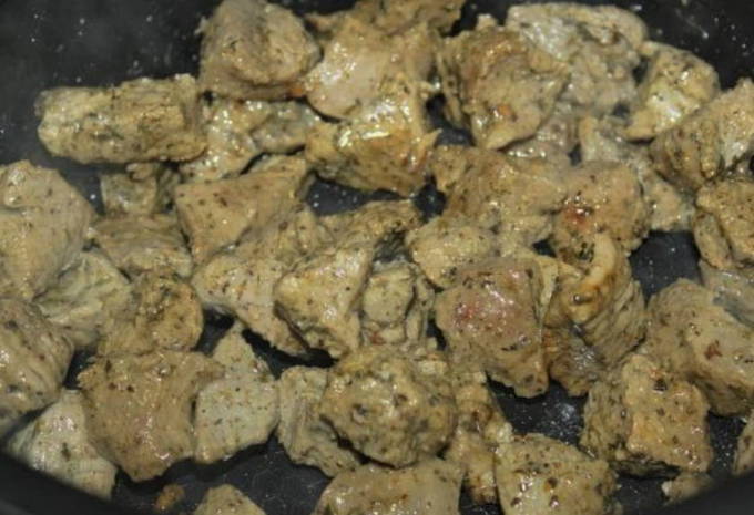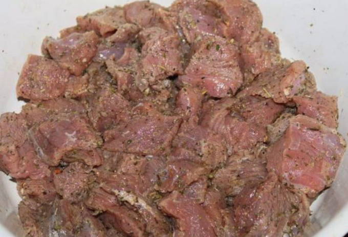 - Droog het vlees met keukenpapier en snijd het in kleine stukjes over de draad. Leg het vlees in een kom, bestrooi met zout, zwarte peper, paprika, een mengsel van kruiden, giet er citroensap over. Meng goed en zet in de koelkast om minimaal anderhalf uur te marineren.