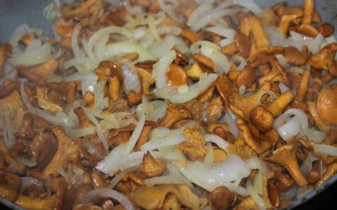 - We bereiden de cantharellen voor: we maken het vuil schoon met een mes en spoelen grondig. Schil de uien en snijd ze in dunne veertjes. Verhit in een aparte koekenpan een kleine hoeveelheid geurloze plantaardige olie, giet de gesnipperde ui. Bak tot ze transparant en licht goudbruin zijn.Voeg vervolgens de voorbereide cantharellen toe. Af en toe roeren, nog zeven tot tien minuten bakken.