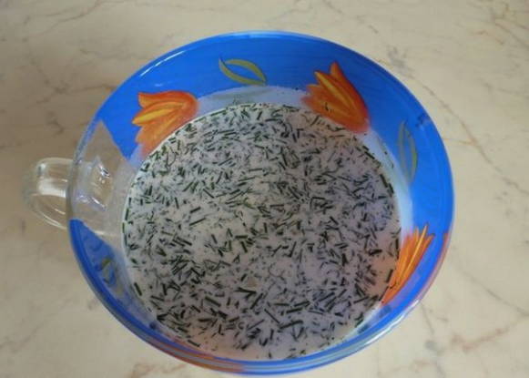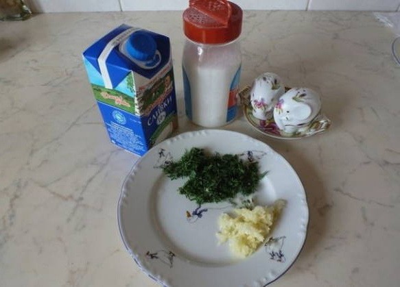 - Pel de knoflook en haal deze door een pers. We wassen de dille, drogen hem en hakken hem fijn met een mes.