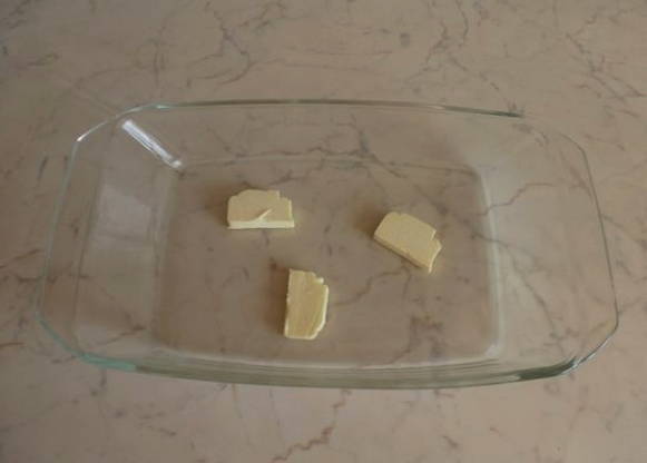 - Leg op de bodem van de ovenschaal 50 gram boter, in stukjes gesneden.