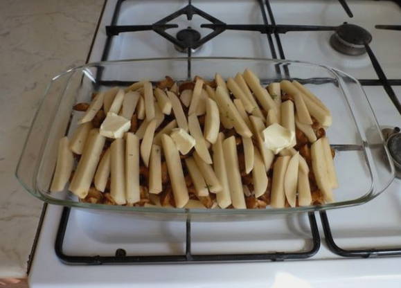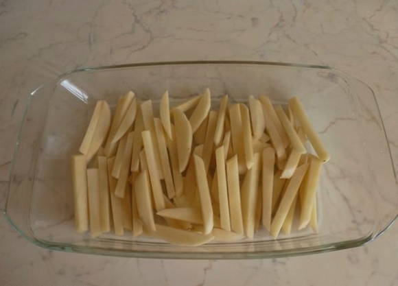 - Aardappels schillen, wassen, drogen en in dunne reepjes snijden. Leg de helft van de aardappelschijfjes op de bodem van de vorm bovenop de boter.