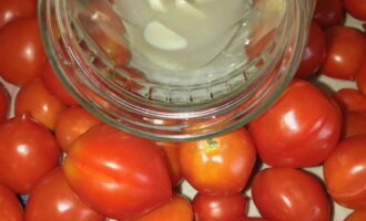 We wassen en steriliseren blikjes en deksels. Voeg op de bodem van de container onmiddellijk zout, suiker toe, giet azijn en voeg stukjes knoflook toe.