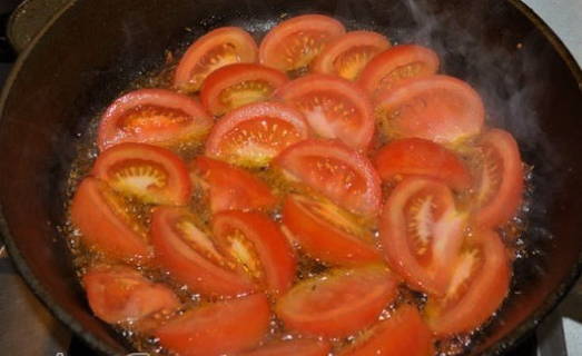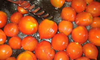 Verwarm een koekenpan voor met plantaardige olie. Hier zetten we de voorgewassen tomaten. Bak ze ongeveer 7-10 minuten en roer voorzichtig.