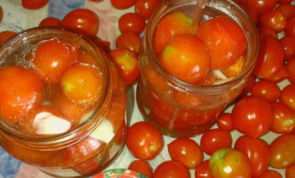 - Vul de pot stevig met tomaten en giet er kokend water over. Steriliseer ongeveer 20-30 minuten in een pan met kokend water. We bedekken eerst de bodem met een handdoek om het glas niet te beschadigen.