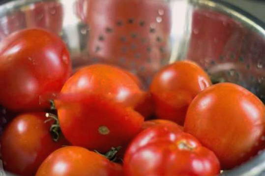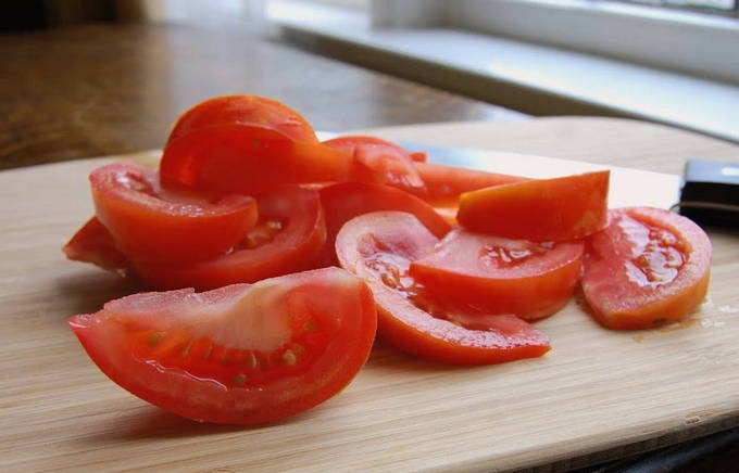 - Rijpe vlezige tomaten kiezen. Spoel ze grondig onder water, verwijder de steel.