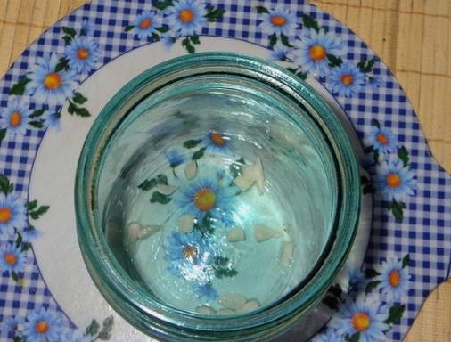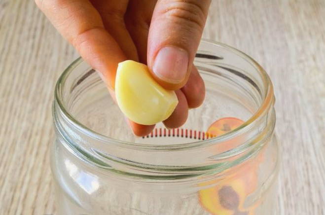 - We steriliseren de potten en leggen wat fijngehakte knoflook op de bodem.