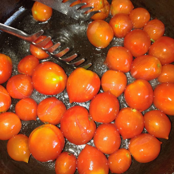Doe de gebakken tomaten meteen in potten en vul ze met kokend water.