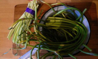 - Was de jonge knoflookpijlen onder stromend water, snijd de zaaddozen af.