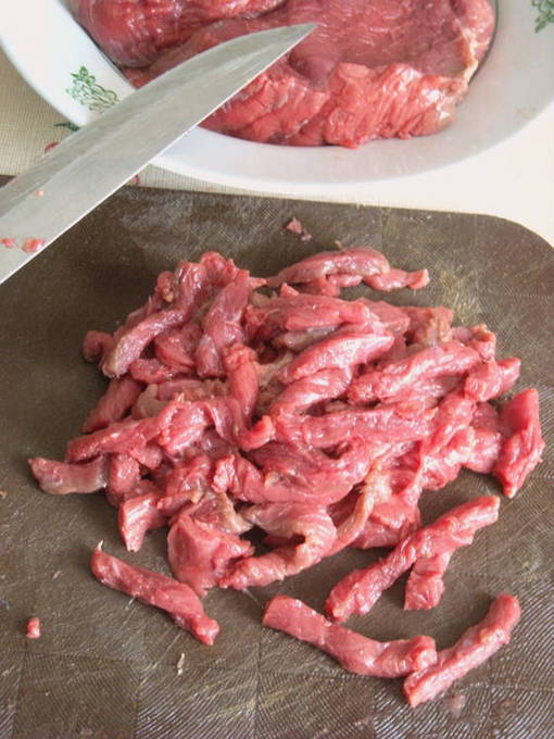 - Was het rundvlees en snij in reepjes. Giet azijn over het vlees, roer en laat marineren.