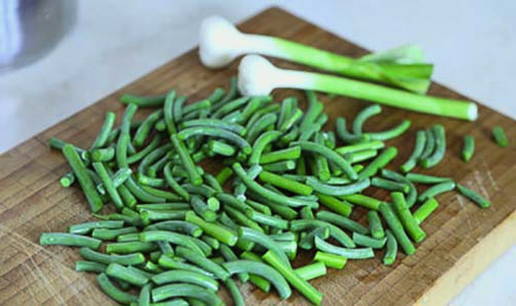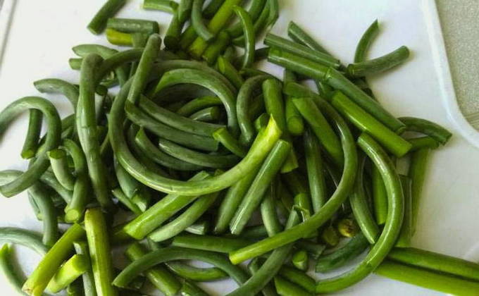 - Was de knoflookpijlen, snij de zaaddozen af en snij de scheuten in reepjes.