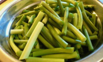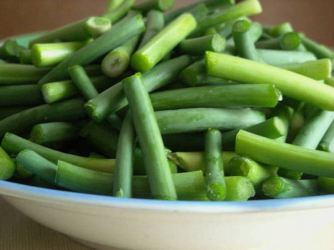 - Was de knoflookpijlen en snijd ze in reepjes van 3-4 centimeter lang.