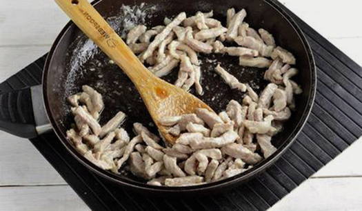 - Snijd het varkensvlees in reepjes en bak aan alle kanten in plantaardige olie.