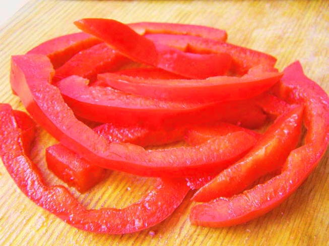 - Snijd de paprika in reepjes.