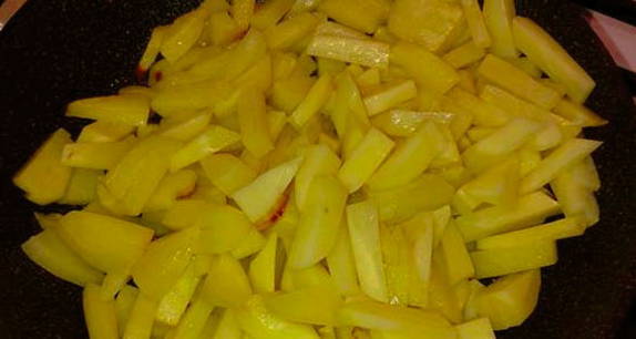 - Giet plantaardige olie in een voorverwarmde pan en bak de aardappelen aan alle kanten goudbruin.
