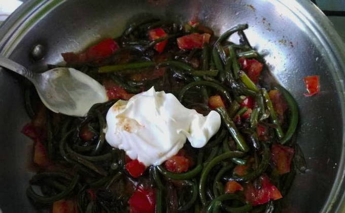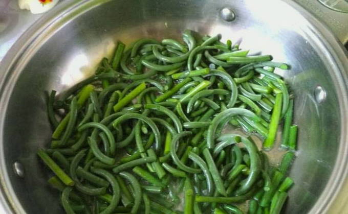 - Breng de knoflookpijlen over naar een voorverwarmde pan, bak in plantaardige olie, af en toe roeren.
