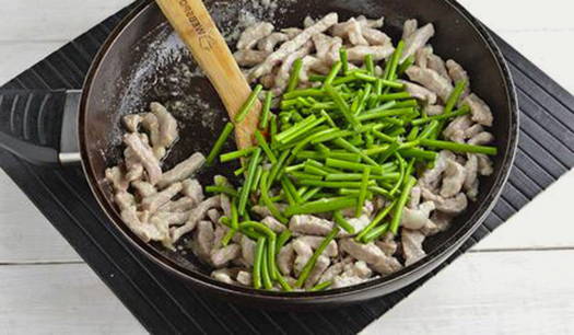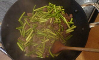 Giet plantaardige olie in de pan. Snijd het vlees in dunne reepjes en bak 2-3 minuten op hoog vuur. Voeg dan de knoflookpijlen toe en bak nog 3 minuten.