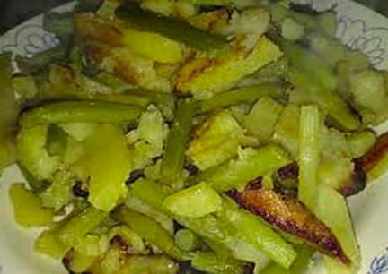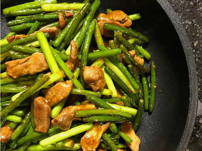 - Gebakken knoflookpijlen met varkensvlees zijn klaar.