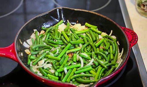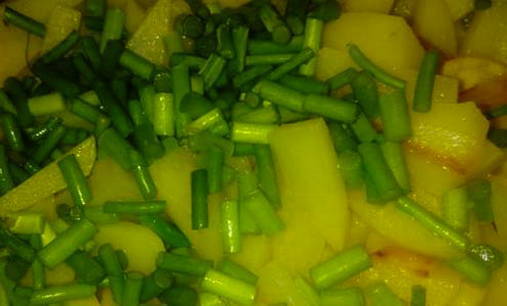 - Voeg als de aardappelen bijna gaar zijn de knoflookpijlen toe en bak nog 7-10 minuten.