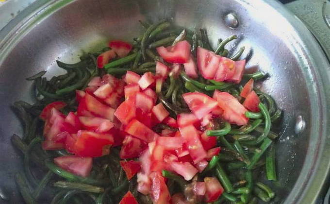 - Was de tomaten en hak ze fijn. Voeg groenten toe aan de pan met knoflook, blijf bakken.